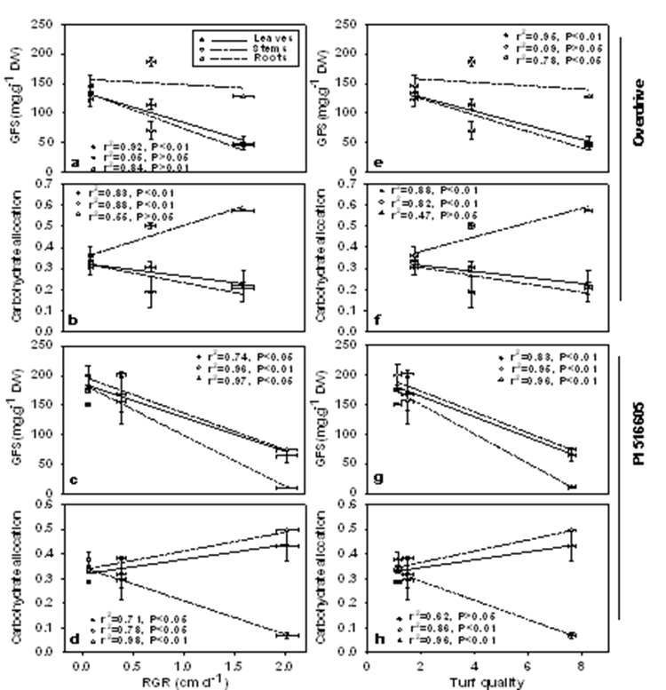 Correlations of GFS, carbohydrate allocation, RGR and turf quality in leaves, stems and roots of two perennial ryegrass accessions PI 538976 and ‘Overdrive’ in response to salt stress. (Image by Dr. HU Tao)