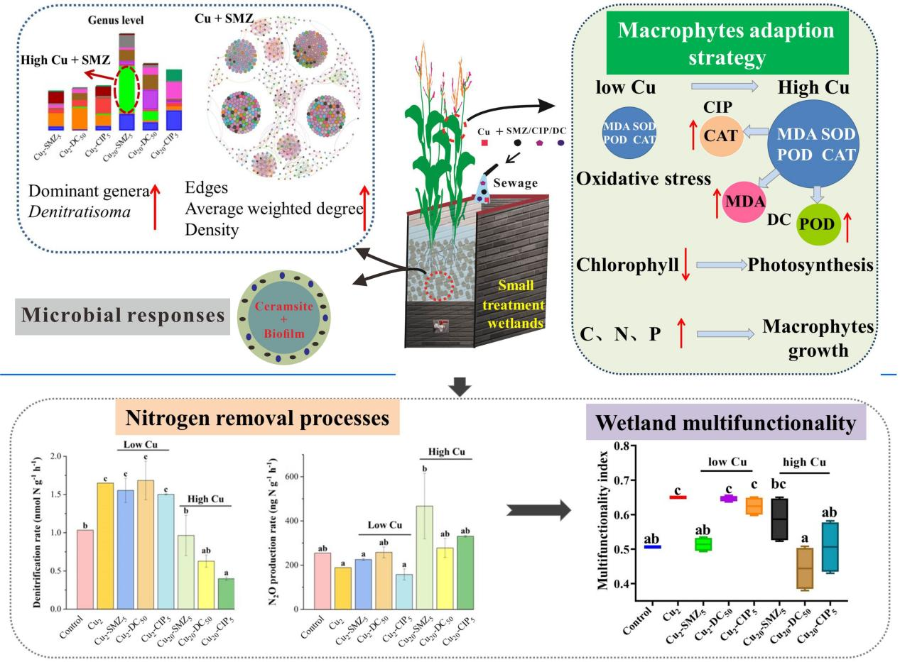 This study demonstrated that high Cu levels, particularly in conjunction with SMZ, inhibited denitrification and anammox, but increased N₂O emissions. Under equivalent concentration antibiotics stress, adding high Cu levels triggered a microbial community shift characterized by reduced diversity, and an enriched abundance of dominant phyla (e.g., Proteobacteria). Microbial co-occurrence networks were more substantially influenced by DC and CIP than SMZ. Antioxidant enzyme activities and malondialdehyde levels exhibited pollutant specific responses, varying with both Cu dosage and antibiotic type. A low Cu dose enhanced wetland ecosystem multifunctionality, but this benefit was reversed under high copper stress, particularly when combined with the antibiotic DC.