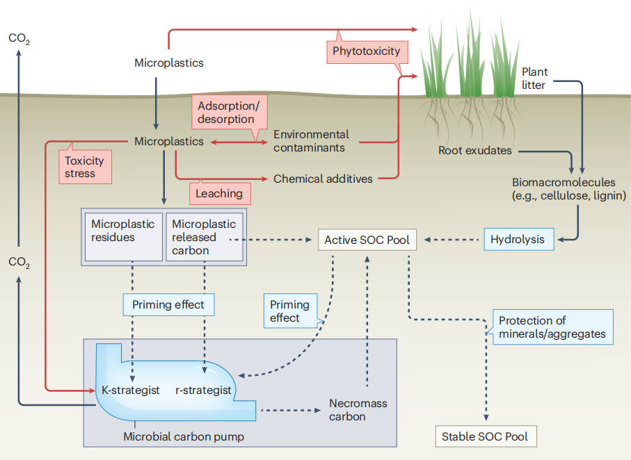 Moreover, microplastic surfaces act as critical interfaces. They can adsorb DOM for long - term preservation and transport, and serve as 'hotspots' for interactions between minerals and organic matter. Additionally, microplastics alter the physical storage of SOC by disrupting soil aggregate structure and carrying carbon sources.