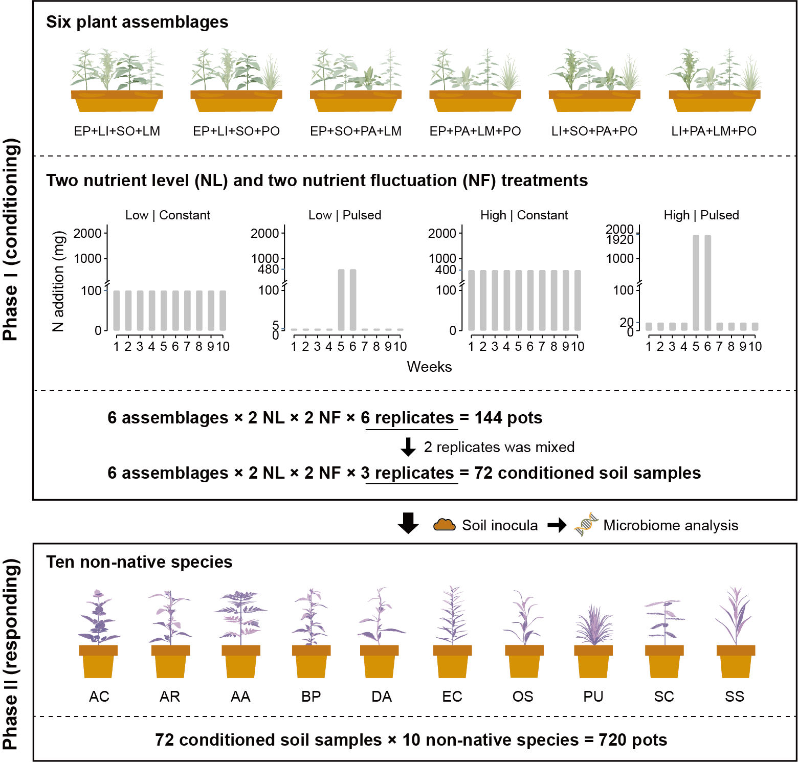 The results showed that nutrient level (high vs. low) and nutrient fluctuation (constant vs. pulsed) interacted significantly to influence soil fungal communities, producing distinct fungal legacy effects that subsequently altered non-native plant performance.