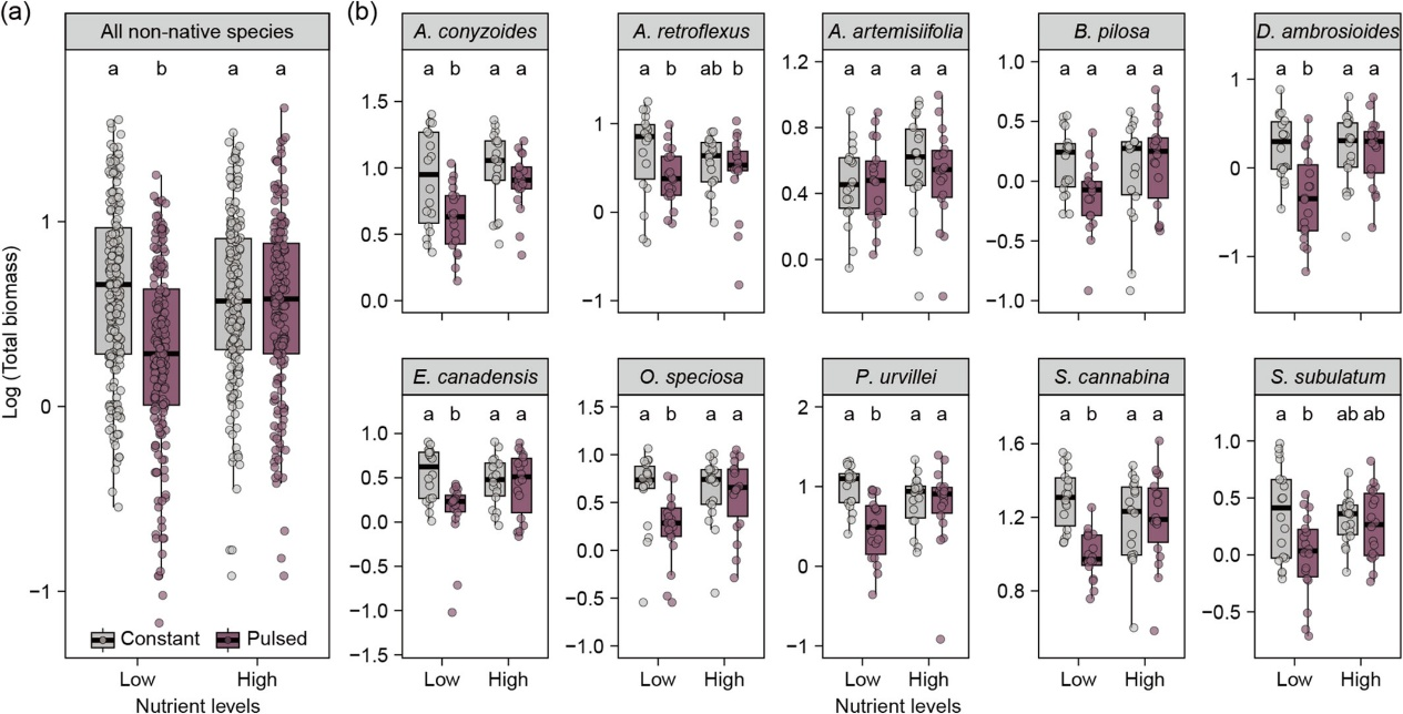 FIGURE 2 Effects of soil fungal legacies generated by different combinations of nutrient levels (low or high), nutrient fluctuations (constant or pulsed) in phase I on growth of non-native species in phase II (Image by WBG)
